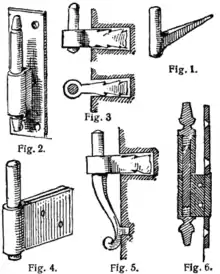 - Gond à patte : ainsi nommé parce que sa tige est coudée d'équerre et aplatie de manière à être arrêtée avec des vis sur le bois