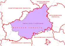 Le gouvernement de Tver était bordé au nord par le gouvernement de Novgorod et, dans le sens des aiguilles d’une montre, par ceux de Iaroslavl, Vladimir, Moscou, Smolensk et Pskov.