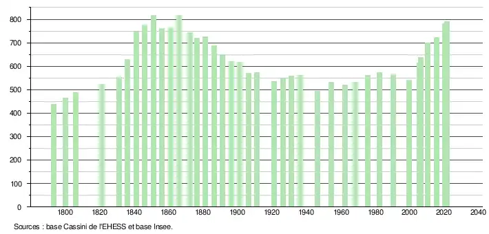 L'évolution du nombre d'habitants est connue à travers les recensements de la population effectués dans la commune depuis 1793. Pour les communes de moins de 10 000 habitants, une enquête de recensement portant sur toute la population est réalisée tous les cinq ans, les populations légales des années intermédiaires étant quant à elles estimées par interpolation ou extrapolation[19]. Pour la commune, le premier recensement exhaustif entrant dans le cadre du nouveau dispositif a été réalisé en 2005[20].