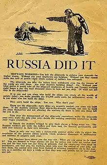 - (en) « The Russians have shown you the way out. What are you going to do about it? You are doomed to wage slavery till you die unless you wake up, realize that you and the boss have nothing in common, that the employing class must be overthrown, and that you, the workers, must take over the control of your jobs, and through them, the control over your lives instead of offering yourself up to the masters as a sacrifice six days a week, so that they may coin profits out of your sweat and toil. »