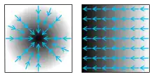 Pour une fonction , le gradient de f se confond avec la dérivée de f. Pour une fonction , où n est un nombre entier ≥ 2, le gradient de f en un point est un vecteur dont la direction est celle de la variation la plus forte de f au voisinage de ce point[2]. Cette notion est liée à celle de différentielle pour des fonctions à valeurs réelles : si f est différentiable en a, la différentielle Df(a) est une forme linéaire ; à cette forme linéaire, si l'ensemble de départ E est de dimension finie, on peut associer un vecteur qui est le gradient de f en a.