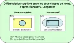 La notion de « délimitation » (bounding) qui permet de définir les noms comptables peut s'appuyer cognitivement sur le contraste avec l'environnement (cas d'une planche de bois), sur la configuration interne de l'objet (cas d'une bicyclette), ou sur la fonctionnalité (cas des parties d'une batte de baseball), ces méthodes n'étant pas exclusives. La délimitation peut être floue, virtuelle (limite supérieure du volume d'une tasse) ou conventionnelle (frontière politique). Les caractéristiques cognitives d'un nom massif seraient l'homogénéité, la « contractibilité » (toute portion d'une masse constitue une masse de même type) et la propriété inverse d'« expansibilité ». Cette dernière contraste avec la « réplicabilité » des noms comptables, opposition linguistique illustrée en anglais par more / another :