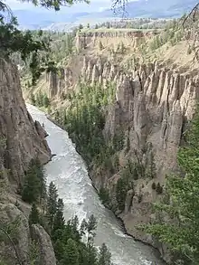 Le Grand Canyon de Yellowstone est le premier grand canyon sur la rivière Yellowstone en aval des chutes Yellowstone dans le parc national de Yellowstone au Wyoming. Le canyon mesure environ 39 km de long, entre 240 et 370 mètres de profondeur et de 400 à 1 200 mètres de large[1]. Le nom « Yellowstone » (« pierre jaune » en français) provient de la couleur des rochers du grand canyon de Yellowstone (vallée en « V ») qui a été formé lors des dernières glaciations avant d'être fortement érodé par la rivière Yellowstone. Contrairement aux apparences, la couleur des pierres provient de l'altération hydrothermale du fer qu'elles contiennent et non du soufre qui est toutefois présent.