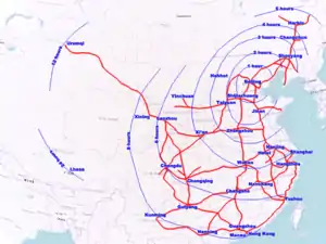 Le réseau national chinois des lignes à grande vitesse destinées aux passagers est conçu pour des vitesses allant de 200 à 350 km/h.
