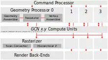 Une unité de calcul (CU) combine 64 processeurs de shader avec 4 unités de mappage de texture (TMU)[5],[6]. Les unités de calcul sont séparées des unités de sortie de rendu (ROP), mais les alimentent[6]. Chaque unité de calcul se compose des éléments suivants :