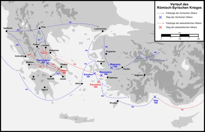Dans le même temps, le fils d'Antiochos III, Séleucos IV, bientôt rejoint par son père, s'attaque au royaume de Pergame mais échoue à prendre sa capitale. C'est à ce moment qu'Antiochos apprend que les Romains traversent la Macédoine en vue de débarquer en Asie et qu'il entreprend en vain des négociations de paix[20]. Il propose aux Romains d'abandonner ses prétentions sur la Thrace et sur les cités grecques d'Anatolie ; les Romains répondent à cet offre en lui demandant d'évacuer toute l'Anatolie à l'ouest du Taurus. Jugeant ces exigences impossibles à remplir, Antiochos se résout à combattre les Romains, d'autant qu'il a pu monter une armée deux fois plus nombreuse que celle des Romains.