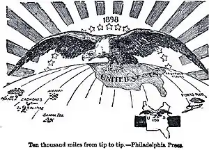 Avec le traité de Paris, l'Espagne a reconnu l'indépendance de Cuba, tout en cédant les Philippines, Porto Rico et Guam aux États-Unis, en échange d'un versement de 20 millions de dollars américains[17], tout ceci marquant le début de l'expansion outre-mer des États-Unis.