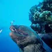 De nature indolente et peu farouche, elle se laisse approcher. Mais il ne faut pas la déranger ni la provoquer car elle demeure capable de mordre lorsqu'un humain l'importune trop (notamment si on essaie de la saisir ou de rentrer un bras dans sa tanière) : certaines sources signalent que ses morsures sont très graves[6] ; d'autres sources sont beaucoup moins alarmistes, indiquent que ce poisson est une des créatures marines qui véhicule le plus grand nombre d'histoires fausses à son sujet, qu'il se laisse facilement caresser et vient même se frotter à l'homme pour se débarrasser des parasites qu'il a sur la peau, qu'il n'a pas de venin et que, en cas de morsure, il suffit de faire des premiers soins, c'est-à-dire nettoyer et désinfecter la plaie et d'éviter de se baigner tant que cette plaie n'est pas cicatrisée.