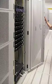 - La colocation : L'hébergeur met, dans son centre de traitement de données, un espace à disposition du client, de sorte qu'il puisse placer son propre serveur à l'intérieur (La plupart du temps dans des armoires spéciales nommées racks ou « baies »). L'hébergeur met également à disposition du client un câble d'alimentation électrique et un câble ethernet pour qu'il puisse alimenter et connecter son serveur à Internet. Ce système est censé coûter moins cher, puisque la location du serveur n'est pas comprise, mais les systèmes de sécurité et des badges dans les centres de traitement de données peuvent coûter plus cher que la location.