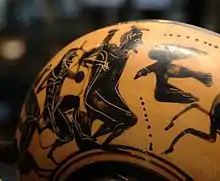 Héraclès portant un arc, sa massue et la peau du lion de Némée, détail du Cratère des Niobides, v. 460–450 av. J.-C., musée du Louvre. | |