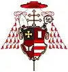 ![]() Écartelé : au I, des comtes archevêques ; au II, de gueules à un rectangle debout d'argent ; au III, de gueules au vol ouvert d'agent ; au IV, fascé de gueules et d'argent. Sur le blason : franc-quartier ou un canton de sinople, à une croix pattée d'or. [13] Ornements extérieurs : Chapeau de sinople d'Archevêque, croix en pal, l'écu timbré du pallium. Quatre lambrequins (deux d'or et deux d'argent). Toque de velours noir, retroussée de contre-hermine, avec porte-aigrette or et argent, surmonté de cinq plumes d'argent. |