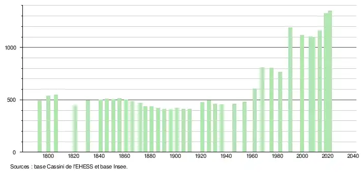 L'évolution du nombre d'habitants est connue à travers les recensements de la population effectués dans la commune depuis 1793. Pour les communes de moins de 10 000 habitants, une enquête de recensement portant sur toute la population est réalisée tous les cinq ans, les populations légales des années intermédiaires étant quant à elles estimées par interpolation ou extrapolation[29]. Pour la commune, le premier recensement exhaustif entrant dans le cadre du nouveau dispositif a été réalisé en 2008[30].