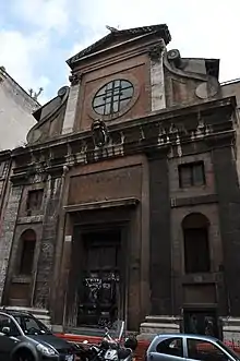 La structure originale du bâtiment n'est pas connue car les premiers véritables travaux de rénovation, datant de 1579, entrainèrent une modification radicale du bâtiment et de son environnement. Après une première implication de Baldassarre Peruzzi dans les dernières années de sa vie (1534-1536), la façade a finalement été rénovée par le jeune Giorgio da Coltre, sous la direction d'Antonio da Sangallo le Jeune qui a élaboré le projet dès 1538-1546[96]. Celui-ci a donné naissance à la structure finale de l'hôpital qui conserve encore ses caractéristiques[47]. Seul un portail extérieur surmonté des armoiries de Colonna subsiste comme témoignage de l'architecture primitive ; au-dessus de celui-ci se trouve la rare représentation du chapeau de cardinal du XIVe siècle[97]. Les travaux commencèrent en 1579 avec l'architecte Francesco Capriani et se terminèrent en 1592 avec Carlo Maderno.