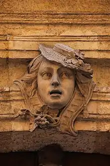 La porte, richement sculptée, est d'origine. Elle est surmontée d'un mascaron à tête de bergère. L'encadrement est à pilastres dédoublés, surmontés de chapiteaux corinthiens[3].