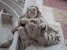 Cul-de-lampe de la façade. Sur le phylactère apparaît la devise (latine) de François Ier : nutrisco et extinguo, qui signifie « je me nourris [du bon feu] et j'éteins [le mauvais] ».