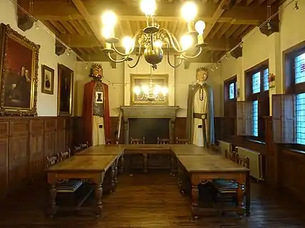 Le premier étage abrite une vaste salle créée par l'architecte Jules Charbonnelle en lieu et place de trois pièces. C'est ici que se sont tenus les mariages et les réunions du conseil communal. Aujourd'hui, elle est surnommée "Salle du Grand Bailli". Son décor comporte deux cheminées Renaissance, celle à gauche de l'entrée est d'origine tandis que celle qui lui fait face en est sa copie fidèle. Leurs briques fonds représentent les profils de l'archiduc Albert et de son épouse l'archiduchesse Isabelle. Les taques de cheminée montrent les armoiries des Rois de France avec les lys et l'autre les initiales de l'empereur Charles Quint. Quant au plafond, celui d'origine a été remplacé après l'incendie de 1914 par une structure en béton armé avec une peinture imitant le bois. Sur les murs plusieurs peintures et gravures montrent des anciens bourgmestres de Braine-le-Comte : Joseph Martel, Aimé Oblin, Félicien Étienne, René Brancart, Henri Neuman et Jean-Baptiste Cornet. Et aussi des personnalités de la ville : Henri-Joseph Rey, Adolphe Gillis, le duc d'Arenberg et Émile Heuchon. Enfin, les sept fenêtres de la salle comportent des vitraux représentant les différents sigles, armoiries et sceaux en lien avec Braine-le-Comte.
