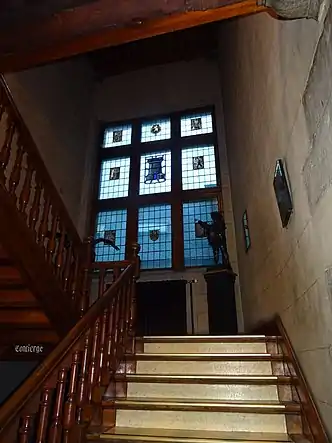 Le palier de l'escalier est éclairé par une large baie vitrée dont les médaillons représentent des corps de métiers et des blasons : le menuisier, le blason de la Belgique, le papetier, l'imprimeur, le blason de Braine-le-Comte, le semeur, le forgeron, les armes du Hainaut et le souffleur de verre.