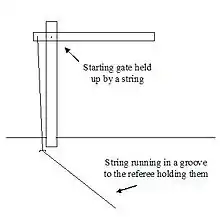 À l'origine, un signal sonore était probablement utilisé pour signifier le départ de la course, que les athlètes semblaient cependant ignorer et démarrer trop tôt. Par conséquent, les officiels conçoivent des mécanismes spéciaux pour assurer le bon départ de la course[1],[2].