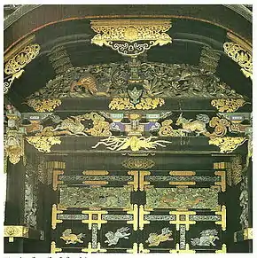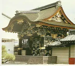 Le karamon (porte) du Hōgon-ji est installé à son emplacement actuel lors de la rénovation du temple en 1602 (voir ill. 5). Il appartient à l'origine au sanctuaire Toyokuni de Kyoto, consacré à Toyotomi Hideyoshi[14]. La porte elle-même est un excellent exemple d'art de l'époque Azuchi Momoyama, connu pour sa décoration étendue et ses couleurs éclatantes, même si l'architecture de la porte est plus chinoise que japonaise. La présence de l'iconographie bouddhique dans les illustrations de la porte est importante. Une caractéristique de l'architecture chinoise du karamon est l'usage déjà mentionné du style poteau-linteau. Par ailleurs, la structure utilise les complexes supports ordinaires 3-en-1 qui assemblent la porte et le toit de la porte. Celle-ci dispose d'un karahafu, ou « toit à pignon chinois »[3]. L'illustration 5 montre que la porte a une courbure du toit unique qui est de style typiquement chinois. La porte est richement décorée de sculptures en bois, d'ornements métalliques, de polychromes et de formes sculpturales. Le toit est richement paré de tuiles décorées qui couvrent les arêtes au sommet du toit (voir ill. 6).