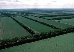 La haie brise-vent ou haie haute composite est une haie haute. Elle est efficace pour protéger les cultures en augmentant la productivité d'une parcelle dans les premiers mètres après la haie. Ces haies présentent de nombreux intérêts pour les cultures en abritant aussi des auxiliaires de l'agriculture[17]. Cette haie composite est constituée d'espèces de haut jet, de bourrage haut et de bourrage bas[18].