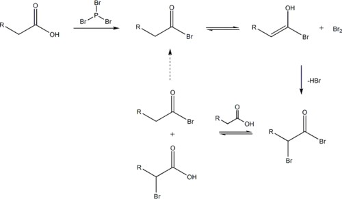 PBr3 remplace l'OH carboxylique par un bromure, ce qui donne un bromure d'acide carboxylique. Le bromure d'acyle peut ensuite se tautomériser en un énol, qui réagit facilement avec le Br2 pour bromer une deuxième fois en position α.