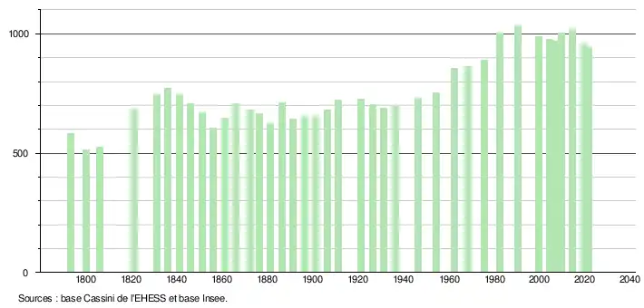 L'évolution du nombre d'habitants est connue à travers les recensements de la population effectués dans la commune depuis 1793. Pour les communes de moins de 10 000 habitants, une enquête de recensement portant sur toute la population est réalisée tous les cinq ans, les populations légales des années intermédiaires étant quant à elles estimées par interpolation ou extrapolation[42]. Pour la commune, le premier recensement exhaustif entrant dans le cadre du nouveau dispositif a été réalisé en 2004[43].