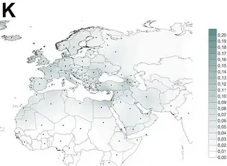 K semble être le plus fréquent dans le Morbihan (17,5 %) et le Périgord-Limousin (15,3 %) en France, ainsi qu'en Norvège et en Bulgarie (13,3 %). Le niveau est de 12,5 % en Belgique, 11 % en Géorgie et 10 % en Autriche et en Grande-Bretagne.