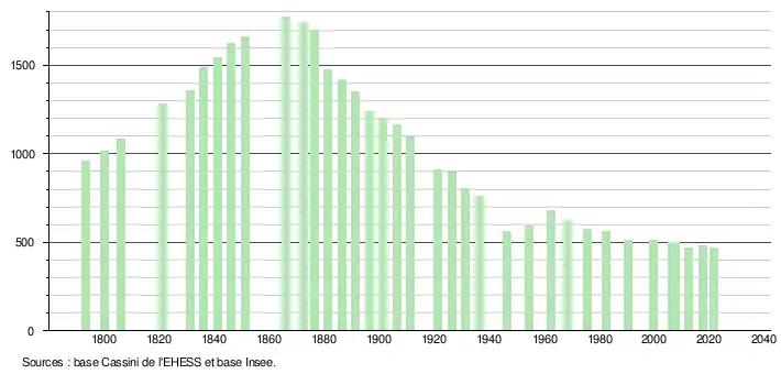 L'évolution du nombre d'habitants est connue à travers les recensements de la population effectués dans la commune depuis 1793. Pour les communes de moins de 10 000 habitants, une enquête de recensement portant sur toute la population est réalisée tous les cinq ans, les populations légales des années intermédiaires étant quant à elles estimées par interpolation ou extrapolation[30]. Pour la commune, le premier recensement exhaustif entrant dans le cadre du nouveau dispositif a été réalisé en 2007[31].