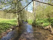 La rivière traverse deux étangs, puis se dirige vers le sud et passe sous le pont de l'Haseltalbrücke (A 3) sur la Bundesautobahn 3. Elle marque la limite entre l'arrondissement de Hiltenberg et l'arrondissement de Main-Spessart, puis se dirige vers le sud-est.