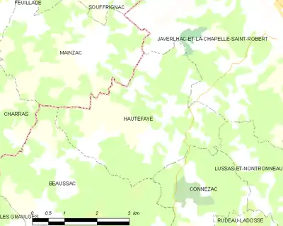 Hautefaye est limitrophe de cinq communes, dont une dans le département de la Charente.