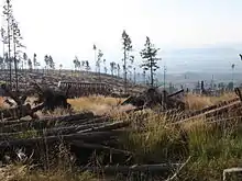Le , un vent violent venant du nord a soufflé entre 15 h 30 et 18 h. La vitesse la plus élevée fut enregistrée à la limite amont de la forêt à une altitude de 1 480 m à 230 km/h[40]. Cette tempête a laissé à nu une bande large de 2 à 5 km et longue de 40 à 50 km sur le versant sud des Hautes Tatras[41]. La superficie totale de la zone endommagée est de 12 600 ha pour environ 2,5 millions de stères[40]. Les conséquences sont toujours visibles actuellement. Outre le fait que le couvert végétal mettra des années à se reconstituer et que le versant sud des montagnes présente toujours un paysage découvert, une nouvelle menace est apparue sur les arbres ayant résisté à la catastrophe. Bien que le massif se situe dans une zone protégée, les arbres tombés ont été enlevés. Dans certaines zones de forêts inaccessibles en particulier dans la vallée de Tichá dolina, ce travail n'a pas pu être fait. Les insectes xylophages se sont multipliés dans les parties dévastées et laissées en friche avant de se répandre sur les forêts ayant résisté au désastre[42].