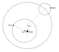 Copernic pense que le centre de l'orbite terrestre (Ot sur le schéma) décrit un épicycle dont le centre tourne lui-même sur un excentrique (en pointillés). De même, le centre du déférent des planètes (Om pour celle de Mars) n'est situé ni sur le Soleil, ni sur la Terre, mais un peu à côté. Les planètes, elles, tournent autour d'un épicycle centré sur leur déférent. La Lune, elle, tourne toujours autour de la Terre (avec un système d'épicycle et de déférent).
