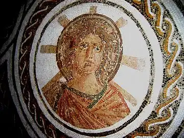 Une mosaïque retrouvée dans la nécropole du Vatican (Mausolée M) représente une figure au style très similaire à celui de Sol/Hélios, couronné de rayons solaires et conduisant un char. Des savants l'ont également identifiée comme étant une représentation du Christ, notant que Clément d'Alexandrie avait également décrit le Christ comme conduisant un char à travers le ciel[20]. D'autres encore doutent de cette association[21], et pensent que la figure n'est qu'une représentation non-religieuse du Soleil.