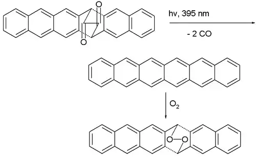 La première synthèse de l'hexacène pur remonte à 1942[5]. En 1955, il est produit par déshydrogénation d'hexacosadéshydrohexacène catalysée au palladium sur carbone[6]. En 1982, il est décrit comme un composé bleu vert qui se décompose vers 380 °C[7]. En 2007, une équipe a annoncé la première synthèse reproductible d'hexacène non substitué, invalidant du même coup les annonces antérieures, à partir de décarbonylation photochimique d'un précurseur dicétone[8] :
