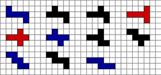 - 5 hexaminos, en bleu, ont une symétrie selon un point, aussi connu comme une symétrie de rotation d'ordre 2. Leur groupe de symétrie possède deux éléments : l'identité et la rotation de 180°.