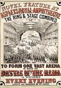 La première pièce écrite spécifiquement pour inclure des chevaux, Timour the Tartar, est également créée à Covent Garden en 1811, puis à New York l'année suivante[10]. Les hippodrames, destinés à une diffusion populaire, reprennent des thèmes connus comme Tamerlan, un conquérant d'Asie centrale, ou le chef militaire ukrainien Ivan Mazepa, ou encore le passé militaire européen avec Marlborough[4]. Mazeppa, or the Wild Horse of Tartary,mis en scène en Angleterre en 1823, est repris dans l'amphithéâtre d'Astley en 1831 puis en tournée aux États-Unis à partir de 1833[11]. D'autres spectacles concernent des adaptations de William Shakespeare (Richard III)[3], des bandits de grand chemin réels et fictifs (Ride to York de Dick Turpin[12], et Paul Clifford[13].
