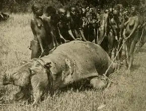 En Afrique, les hippopotames sont connus sous diverses appellations, dont seekoei (Afrikaans), mvuvu (Venda), kubu (Lozi) et mvubu (Xhosa, Swati et Zoulou) dans le sud[46] ; kiboko (Swahili), ensherre (Nkore), tomondo (Nyaturu), nvubu (Luganda), ifuru (Luyia), emiria (Ateso), magawit (Sebei), kibei (Kalenjin) et olmakau (Maasai) dans la région des Grands Lacs[6] ; :256 et ጉማርረ/gumarre (Amharique)[47] et jeer (Somali) dans la corne de l’Afrique[48].