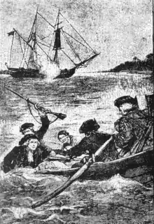 ![]() Illustration du chapitre 17 du roman montrant l'Hispaniola par Georges Roux (1850-1929) |
