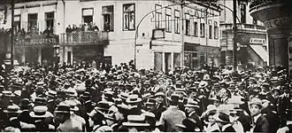 Dans le courant de la Première Guerre mondiale que la Roumanie fit aux côtés de l'Entente, Bucarest fut, du au , occupée militairement par les empires centraux, provoquant la retraite du gouvernement à Iași. Bucarest fut pillée par les Austro-Allemands (commandés par le général allemand Erich von Falkenhayn, installé au palais royal). Plus de 215 millions de lei ont été demandés par la nouvelle administration dans le but de couvrir leurs dépenses, dont 86 à la capitale ; en outre, les trains de marchandises ou de permissionnaires partant pour l'Autriche ou pour l'Allemagne ne revenaient pas à vide : ils ne revenaient pas[72]. Après l'Armistice de 1918, lorsque l'administration Roumaine s'est réinstallée dans sa capitale, les trois quarts des véhicules de 1916 manquaient, les usines et centrales électriques étaient en panne, les bureaux des administrations avaient été vidés de leurs meubles, transformés en bois de chauffage comme la plupart des arbres de la ville. Il n'y avait plus de bétail ni de volaille dans les fermes alentour, et les entrepôts étaient vides, tout comme les pharmacies. Certes, Bucarest était désormais la capitale d'un pays vainqueur ayant presque triplé son territoire : la Grande Roumanie (reconnue par les traités St-Germain, Neuilly et Trianon) mais c'était une capitale affamée, en proie au typhus et parcourue de soldats de différentes armées, débandés et désespérés, parfois mutinés et partisans du Parti socialiste roumain nouvellement créé, qui réclamaient l'abolition de la monarchie et l'établissement d'une république socialiste. Le , les troupes royales, encadrées par les officiers français de la mission Berthelot, tirèrent sur des manifestants qui chantaient l'Internationale[73].