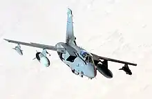 Au cours de la préparation de la guerre du Golfe, les chasseurs de la RAF sont basés en Arabie saoudite et au Koweït. Le 17 janvier 1991, la campagne aérienne principale débute au cours duquel plus de 100 avions de la RAF participent à pratiquement tous les rôles possibles[44]. Cela marque un tournant important dans l'histoire de la RAF car ce fut la première fois que l'armée utilisait des munitions à guidage de précision en quantités importantes. Dans les années suivant la fin de la guerre, la RAF est impliquée dans des opérations visant à faire respecter les zones d'exclusion aérienne au-dessus de l'Irak et participe au bombardement de l'Irak en 1998[45].