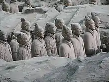 L'État de Qin est créé par la dynastie Zhou (v. 1050-256 av. J.-C.) dans le double but de servir d'avant-poste consacré à l'élevage des chevaux et d'être un État tampon défensif contre les armées des peuples nomades Rong, Qiang et Di[1]. Après la conquête en 221 av. J.-C. des six autres royaumes combattants[1],[note 5], Ying Zheng, le roi de Qin, unifie la Chine en un empire centralisé divisé en 36 commanderies[2]. Ayant pris le contrôle d'une grande partie de la Chine historique, il affirme son prestige en prenant le titre de Huangdi (皇帝), ou « empereur », qu'il crée pour l'occasion et change son nom en Qin Shi Huang, ce qui signifie "premier empereur de Qin"[2]. Selon les historiens de l’époque Han, il utilise des méthodes impitoyables pour conserver le pouvoir[3].
