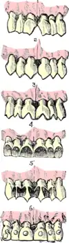 En Angleterre, John Hunter publie en 1771 The Natural History of the Human Teeth (Histoire naturelle des dents humaines) et en 1778 A Practical Treatise on the Diseases of the Teeth (Traité pratique sur les maladies des dents), avec des descriptions détaillées de l'anatomie et de la physiologie des dents[67]. L'intérêt de Hunter se porte notamment sur la transplantation des dents. Il ne voit pas cependant que dans de nombreux cas, la transplantation transmet les maladies infectieuses, notamment la syphilis. Il pense que cela n'est possible que pour des dents purulentes. De nombreux dentistes mettent au point diverses conditions qu'un donneur de dent doit remplir pour minimiser la transmission de maladies[68]. La transplantation de dents a déjà été pratiquée par les anciens Égyptiens, puis par les Étrusques, les Grecs et les Romains[69]. Les premiers points de repère écrits se trouvent en 1594[70]. En 1685, Charles Allen d'York fait des exposés détaillés sur les transplantations hétéroplastiques (de l'animal à l'homme), y compris la description de la manière dont il faut immobiliser l'animal. C'est le premier livre sur la dentisterie paru dans l'espace anglophone et il comprend de remarquables connaissances en anatomie et en physiologie[71]. Ce ne sera que dans les années 1930 que la guérison de dents transplantées sera étudiée histologiquement par Heinrich Hammer (1891–1972). Il faut préserver entièrement le desmodonte pour aboutir à la guérison, sinon le transplant commence par s'ossifier puis est résorbé[72],[73].