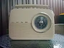 Le récepteur « toutes ondes » couvrant GO[21], PO[22] et OC[23] (voire BE[24]) est dans toutes les familles. C'est un superhétérodyne à 5 ou 6 tubes dont un « œil magique » pour l'accord des stations, avec un cadre orientable interne[25], et une entrée « pick-up » pour écouter les premiers microsillons. Un cadran lumineux indique les noms des stations en clair comme Radio Paris, Paris Inter, BBC, Radio-Luxembourg, etc., tandis qu'une aiguille désigne la station sélectionnée. Les commandes se font plus sophistiqués avec des contrôles de tonalité et la sélection de la gamme d'onde par clavier. L'apparition de matières plastiques modernes permet la réalisation de postes à l'aspect plus travaillé en association au bois dans un premier temps, avant de définitivement supplanter celui-ci, proposant toujours davantage de formes (rondes ou anguleuses) et de coloris divers (ivoire, bordeaux, rouge corail, bleu, vert pistache ou gris anthracite).