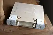 Au XVIIIe siècle (ou à la fin du XVIIe siècle[178]) les premières pièces de titre apparaissent[179],[180],[181]. Il s'agit d'une pièce fine de cuir ou, plus rarement, de papier, de couleur unie et vive (rouge, vert…[181]), collée sur le dos de la reliure et sur laquelle est poussé le titre[182]. Elles deviennent nécessaires lorsque la peau de couvrure de la reliure comporte par exemple des motifs à forts contrastes (comme le motif « raciné ») ou lorsqu'elle est teinte en fauve[183]. Elles permettent ainsi de rendre le titrage plus apparent et plus lisible[182].