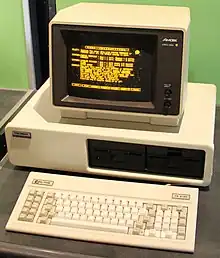 IBM répond à la réussite de l'Apple II avec son IBM PC, qui sort en . Comme l'Apple II et les systèmes S-100, celui-ci est basé sur une architecture ouverte, ce qui permet à des tiers de le développer. Il utilise le processeur Intel 8088 cadencé à 4,77 MHz. Le premier modèle utilise une cassette audio pour le stockage externe, mais offre aussi un lecteur de disquettes assez cher en option. Le lecteur de cassette n'ayant jamais été populaire, il sera supprimé sur le PC XT de 1983[11]. Le XT accueille, lui, un disque dur de 10 Mo à la place de l'un des deux lecteurs de disquettes et voit le nombre de ses ports d'extension augmenter de 5 à 8. Alors que le PC original ne pouvait accueillir que jusqu'à 64 ko sur la carte principale, la nouvelle architecture permet de recevoir jusqu'à 640 ko de RAM grâce à des cartes. Les révisions ultérieures augmenteront la limite à 256 ko sur la carte principale.