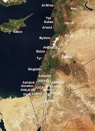 Pour les Grecs (de Grèce vivant au Liban), qui utilisèrent les premiers le nom de Phénicie, le territoire s'étendait sur la zone côtière comprise entre le mont Casius au nord et Haïfa au sud. À l'intérieur de cette zone, les cités d'Ougarit (Ras-Shamra), d'Arwad, de Byblos (Jbeil), de Béryte (Beyrouth), de Sidon (Saïda), de Tyr (Sour) et d'Akka, constituaient les fameuses cités-États. La Phénicie occupait alors cette bande côtière, entre la montagne libanaise et la mer Méditerranée. Un espace varié entre sites portuaires, petites plaines ainsi qu'un arrière-pays de montagne, où poussent sapins et cèdres.