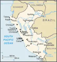 Le mouvement d'émancipation de la colonie commence avec le soulèvement des propriétaires terriens d'origine espagnole (1811-1824). L'Argentin José de San Martín et le Vénézuélien Simón Bolívar sont à la tête des troupes rebelles. Après avoir débarqué dans la baie de Paracas avec une armée composée en grande partie de Chiliens et d'Argentins[37],[38], San Martín s'empare de Lima et déclare, le 28 juillet 1821, l'indépendance du Pérou vis-à-vis de l'Espagne[39].
