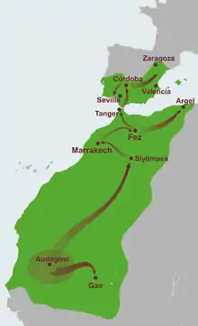 La lutte des Almoravides contre les Hilaliens (des tribus arabes venues de l'est, envoyées par les Fatimides) puis leur chute en 1147 aux mains des Almohades, contribuent à désorganiser les routes caravanières de l'ouest du désert, au profit de Tombouctou plus à l'est[10]. Les Sanhadja se retrouvent ainsi isolés du Maghreb pendant un siècle. Au Maroc, les Almohades (issus de la tribu berbère des Masmoudas dans la région du Souss) concentrent leur attention vers le nord et l'est.