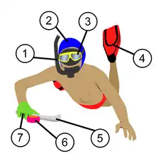 - (beaucoup plus rarement) à un choc à l'oreille avec une palme pouvant entrainer une perforation du tympan c'est pour cela que le bonnet est équipé de protège oreilles (choc barotraumatique).