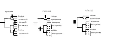 Présentement, en ce qui concerne l’évolution de la segmentation des bilatéraux, trois hypothèses sont postulées par plusieurs biologistes. La première n’a pas rapport à l’homologie, mais les deux dernières hypothèses démontrent une homologie. La deuxième postule qu’il y a une homologie des segmentations parmi les protostomiens et les chordés, mais que plusieurs des embranchements ont perdu cette segmentation. La dernière postule qu’il a une homologie parmi les bilatéraux mais que plus tard, encore plus d’embranchements ont perdu cette segmentation. Malgré les similarités retrouvées dans les divers organismes reliés, il n’y a pas assez de preuves et recherches pour conclure l’homologie des segmentations. Par exemple, dans l’évaluation de la deuxième hypothèse, le gène engrailed, connu pour exprimer les bandes segmentaires chez les arthropodes, a été considéré comme homologue chez les annélides et les arthropodes. Son expression chez les annélides semble jouer un rôle dans la segmentation, mais vu qu’il est exprimé après la séparation du primordium ganglionnaire, son rôle dans le processus de segmentation est douteux. Dans le cas de l’évaluation de la troisième hypothèse, le gène her1 retrouvé chez les poissons-zèbres est présumé d’être l’orthologue du gène pair-rule (pair-rule gene) hairy, responsable du développement des segments embryonnaires chez les insectes, car il imite son patron d’expression. Ceci suggère que l’ancêtre commun des protostomiens et deutérostomiens était segmenté, ainsi les segments de toutes les bilatéraux sont homologues. Malheureusement, il n’est pas encore certain si le gène her1 des poissons-zèbres s’agit actuellement de l’orthologue du gène pair-rule hairy.